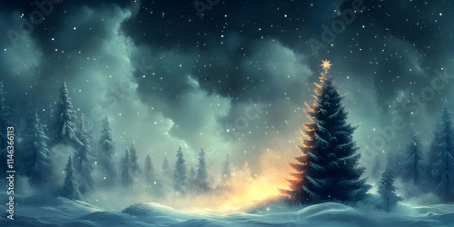 © Siasart Studio, Fototapeta premium Winter Wonderland: Snowy Forest, Starlit Night, Illuminated Tree