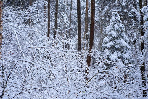 © novolodskiy, Fototapeta premium Winter wonderland with fir trees.