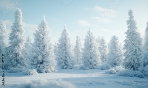 Naklejka premium Winter wonderland with frosted pine trees covered in sparkling snow, bathed in a cool bluish-white glow.