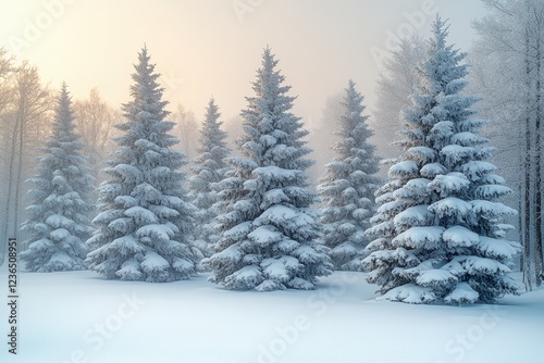 Naklejka premium Winter wonderland with snow-covered evergreen trees in the serene morning light