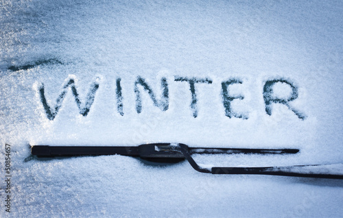 Naklejka premium Winter written in snow on car windscreen below windscreen wiper