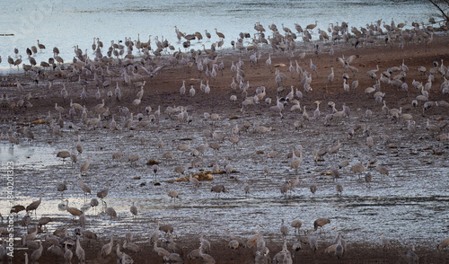 Fototapeta premium Wintering sandhill cranes gathered at the water's edge in Hiwassee Wildlife...