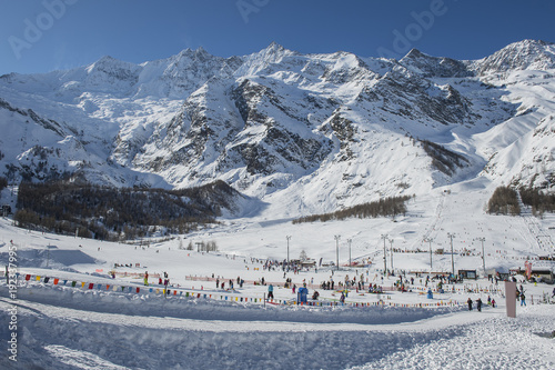 Obraz premium Winterlandschaft mit Skifahrern, Saas Fee, Wallis, Schweiz
