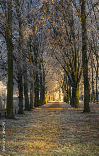 Naklejka premium Winterliche Idylle, Weg ins Licht, Baumreihe mit leichtem Schnee und Raureif...