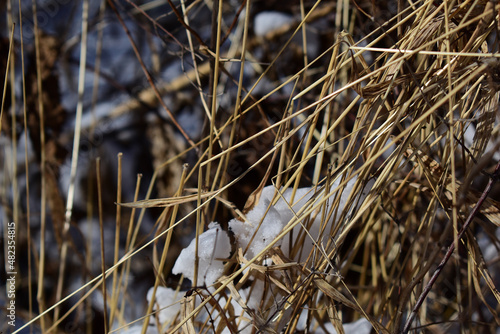 Fototapeta premium Winterliches altes Gras, das durch Schnee bricht im Winter als Hintergrund...