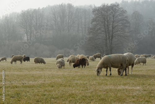 © Grubärin, Fototapeta premium Winterliches Idyll auf der Schafweide.