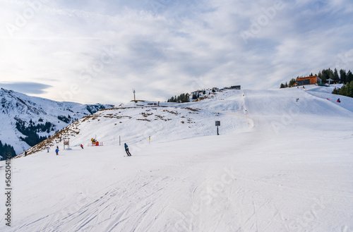Obraz premium Wintry landscape on Hahnenkamm mountain in Austrian Alps in Kitzbuhel. Winter...