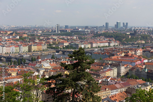 Obraz premium Wiosenne miasto Praga z zieloną przyrodą i kwitnącymi drzewami ze wzgórza Petrin, Czechy