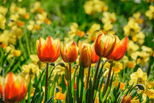 © Tomajasi, Fototapeta premium Wiosenne tulipany w miejskim skwerku o poranku..