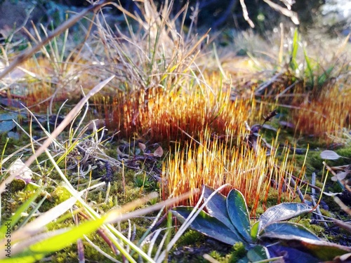 © Ola, Fototapeta premium Wiosenny rozwijający się pomarańczowy mech na łące