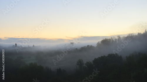 © Simone, Fototapeta premium wioska we mgle w Toskanii