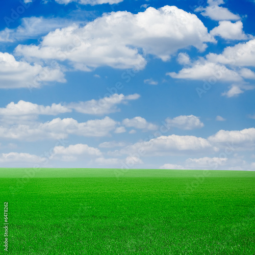 © Serghei V, Fototapeta premium Wiosną zielone pole pokryte trawą i pięknym błękitnym niebem