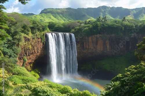 Fototapeta premium Wipwil falls cascading down a cliff in kauai, hawaii, creating a rainbow