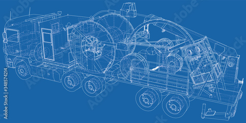 © mirexon, Obraz premium Wire-frame line coiled tubing truck isolated on white. Vector rendering of 3d.