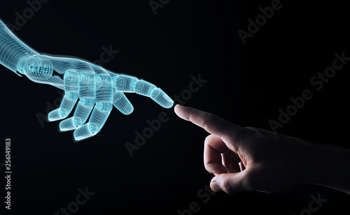Obraz premium Wireframed Robot hand making contact with human hand on dark 3D rendering