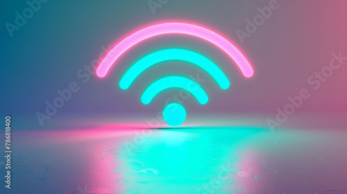 Fototapeta premium Wireless icon, neon sign and creative with internet, network and metal background for connection. Cyberspace, signal and graphic for communication, online information and data technology for iot