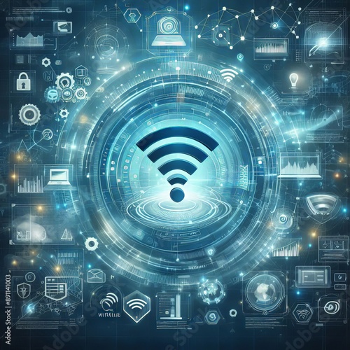 © Vladimir Steblev, Obraz premium Wireless network and connection abstract data background with wifi symbol