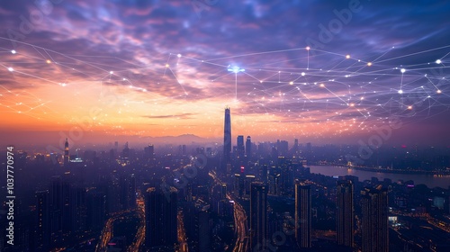 © Farid, Fototapeta premium Wireless network and Connection technology concept with Abstract Bangkok city background in panorama view.