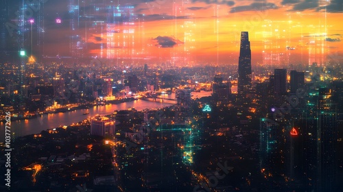 © Farid, Fototapeta premium Wireless network and Connection technology concept with Abstract Bangkok city background in panorama view.