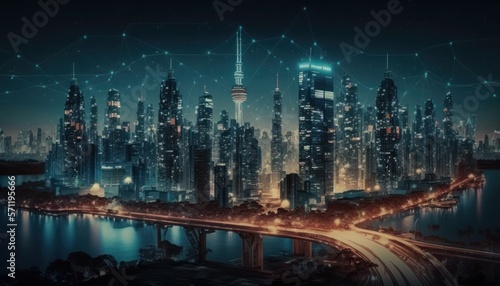 © AI BLONDY, Fototapeta premium Wireless network and Connection technology concept with Abstract city background, generative ai
