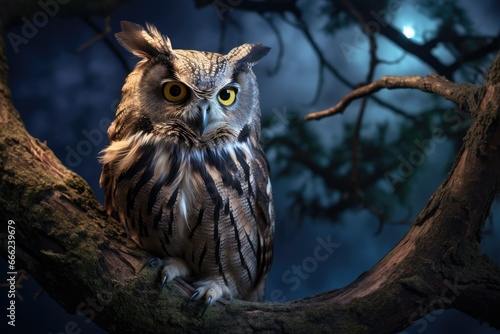 Fototapeta premium Wise owl perched on a tree branch. Generative AI