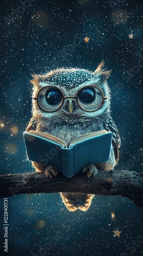 Fototapeta premium Wise Owl Reading a Book Under a Starry Night Sky
