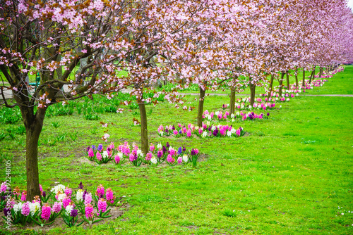 Fototapeta premium Wiśnie z rzędu. Ogród wiosna kwiat.
