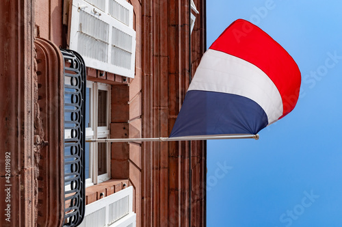 Naklejka premium Wissembourg, France. September 13th, 2009. A French flag flies from the city hall.