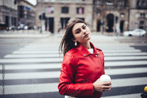 Fototapeta premium Wistful female with coffee on street