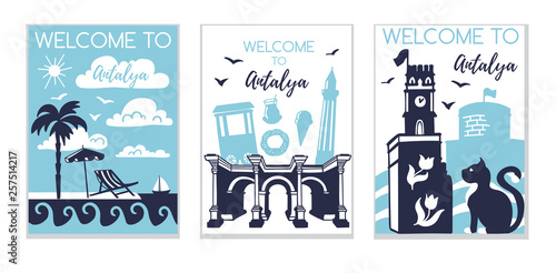 Fototapeta premium Witamy w Antalyi. Koncepcja podróży do Turcji. Zestaw trzech ilustracji wektorowych z symbolami sylwetka Antalyi w nowoczesnym stylu płaski. Karta, plakat, ulotka, projekt druku do promocji podróży.