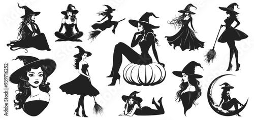 © MicroOne, Naklejka premium Witch cute lady silhouette set in pin up retro style. Sitting on top of pumpking flying broom portrait in a witch hat laying staying. Simple black and white flat isolated vector clipart collection