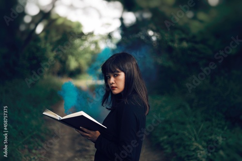 © Mallika, Obraz premium Witch girl making spooky magical in the dark forest. Asian girl with spooky dark magic at forest.