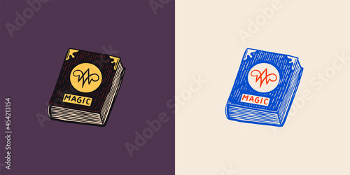 Obraz premium Witch spell book. Mystical alchemy recipes. Astrology symbol. Magic Boho illustration. Hand drawn engraved sketch for tattoo or t-shirt.