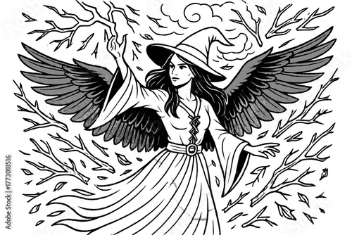 © Olha, Fototapeta premium Witch Summoning Storms. Enchanted witch with raven wings summoning storms with lightning and broken branches flying, black and