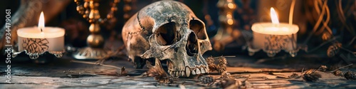 Fototapeta premium Witchcraft Altar Featuring Cat Skull and Enchanted Candles