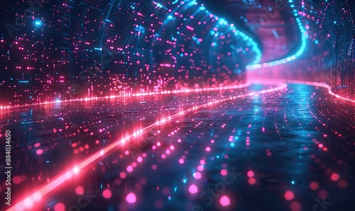 © minhnhat, Naklejka premium With a dark blue abstract background illuminated by neon lights, this futuristic scene showcases a high-speed network, big data processing in a data center, and server technology