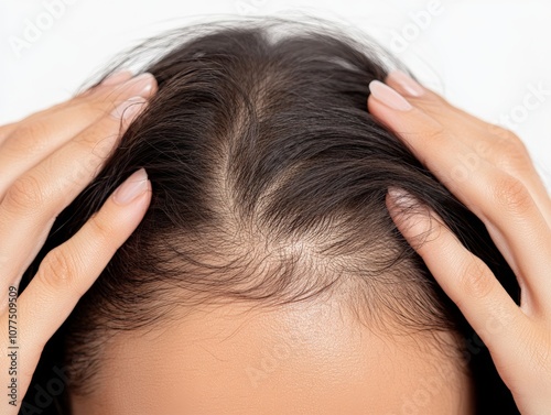 © Helen-HD, Naklejka premium With fingers gently placed on her scalp, the woman closely inspects her hair, revealing the beginnings of hair loss, reflecting concern and contemplation