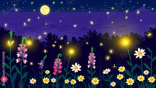 Fototapeta premium with glowing fireflies among pixel foxgloves and daisies, retro moon shining...