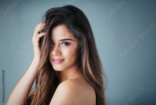 Obraz premium With great hair comes great responsibility. Studio portrait of a beautiful young woman posing against a gray background.