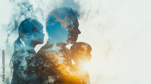 © CreativeIMGIdeas, Fototapeta premium With in the area with a white background, the Double Exposure of the person, family, woman reflects a joyful expression. A livable world happy concept.