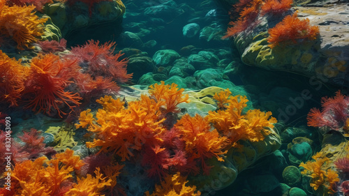 Fototapeta premium Within the Algal Bloom Glade, vibrant algae form intricate patterns on the rocks, their vivid colors creating a mesmerizing underwater tapestry, Generative AI