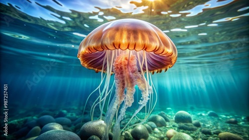 Fototapeta premium Within the aquamarine depths, a ghostly jellyfish glides effortlessly, its...
