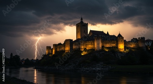 © lina, Fototapeta premium withstands lightning at riverside during twilight