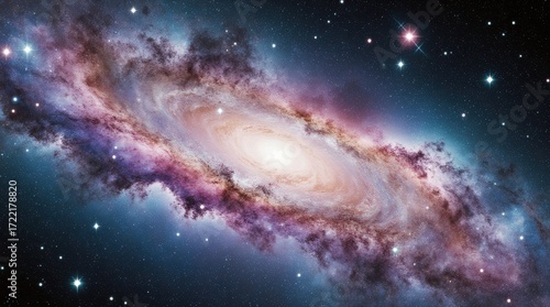 Fototapeta premium Witness the breathtaking cosmic dance of a vibrant spiral galaxy shimmering...