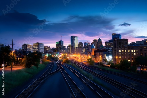 Fototapeta premium Witness the mesmerizing city skyline, a vibrant urban photograph illuminated by neon-lit twilight.