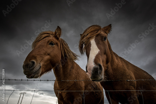 © schame87, Fototapeta premium Witzige Island-Pferde vor dunklen Wolken