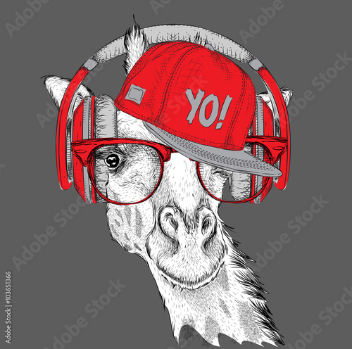 Fototapeta premium Wizerunek żyrafy w okularach, słuchawkach i hip-hopowej czapce. Ilustracji wektorowych.