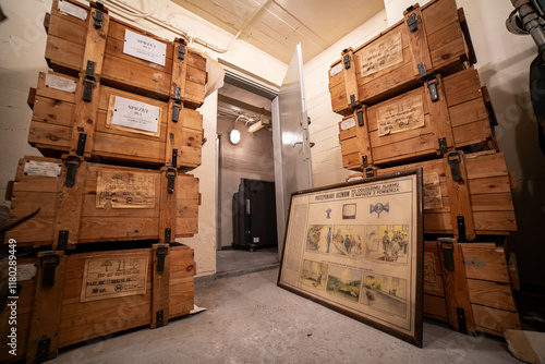 © Adam.rtk, Fototapeta premium Wnętrze schronu z drewnianymi skrzyniami
