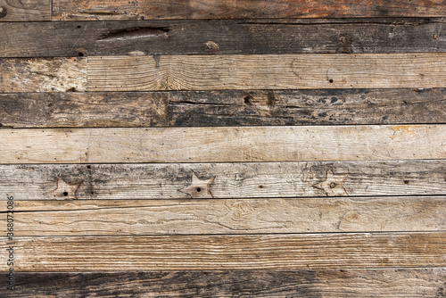 © ChompopsonG, Naklejka premium Wodden pattern of classic wood plank wall texture background. Retro decoration material for classical building