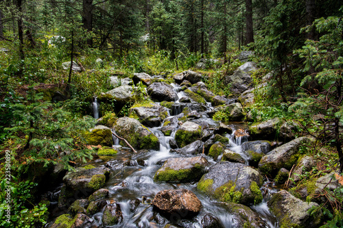 © Jim Ekstrand, Fototapeta premium Wodospad i omszałe głazy w bujnym zielonym lesie - Rio Nambe w Santa Fe National Forest w Nowym Meksyku